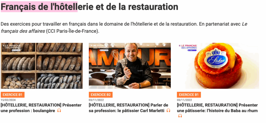 RFI ‘Français facile’ et ‘Français des affaires’ utilisent de courts reportages pour progresser en français grâce à des exercices et s’entrainer selon les niveaux A1, A2, B1, B2 au DELF: (Diplôme élémentaire de langue française, TCF et DFP (Diplôme de français professionnel CCI)
