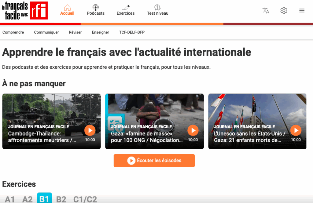 RFI ‘Français facile’ et ‘Français des affaires’ utilisent de courts reportages pour progresser en français grâce à des exercices et s’entrainer selon les niveaux A1, A2, B1, B2 au DELF: (Diplôme élémentaire de langue française, TCF et DFP (Diplôme de français professionnel CCI)