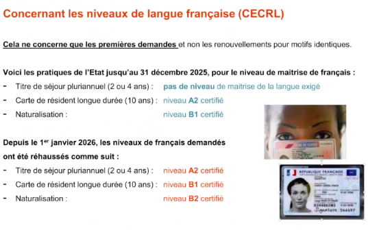 Depuis la loi n°2024-42 du 26 janvier 2024, le niveau de français exigé augmente. Elles sont appliquées le 1er janvier 2026 :
