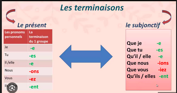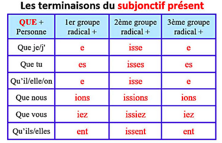 - Il se forme sur le radical (racine) de la 3eme personne du pluriel du présent de l’indicatif auquel on ajoute les terminaisons : -e, -es, -e, -ions, -iez, -ent. (voir dessin)